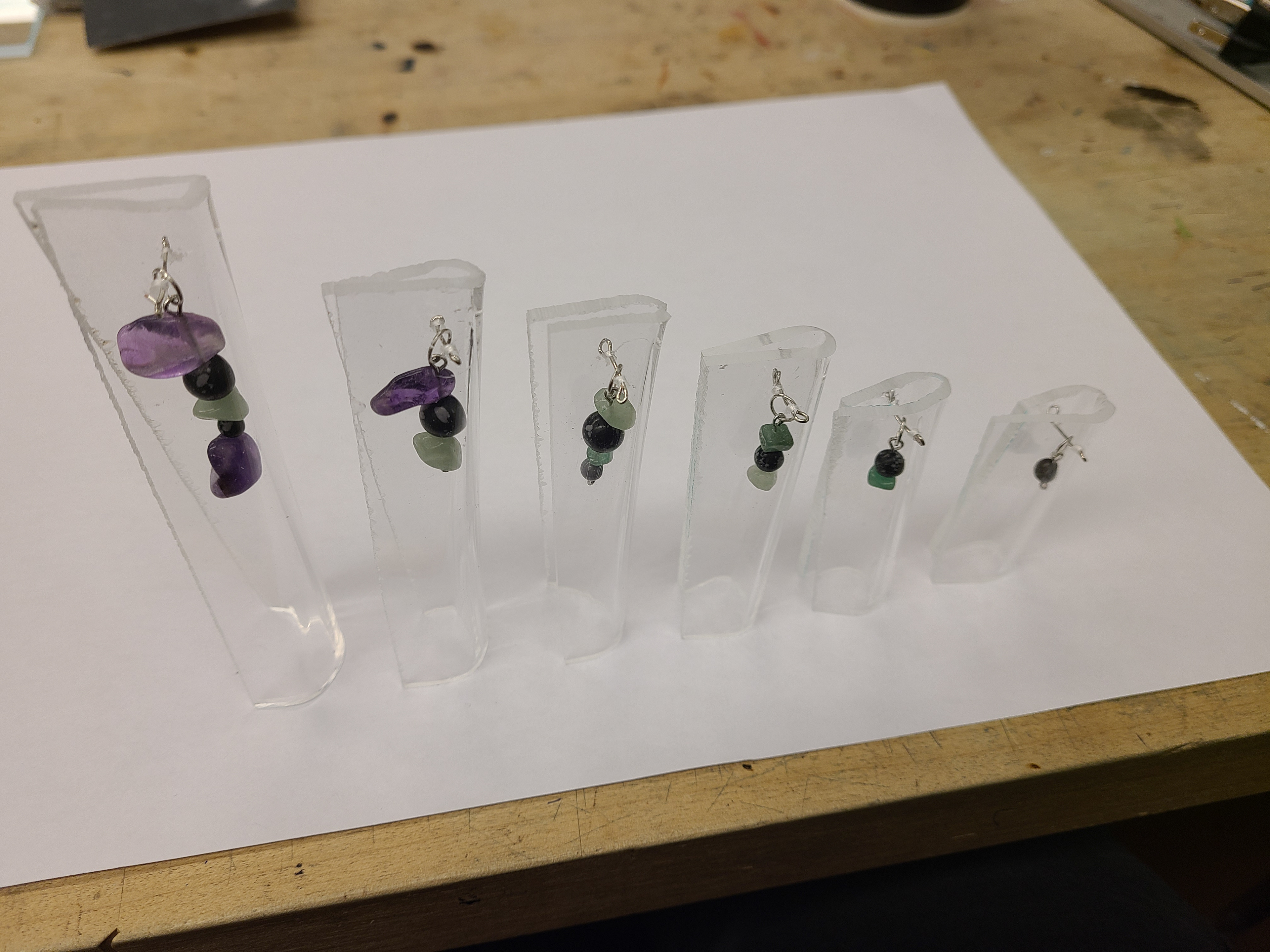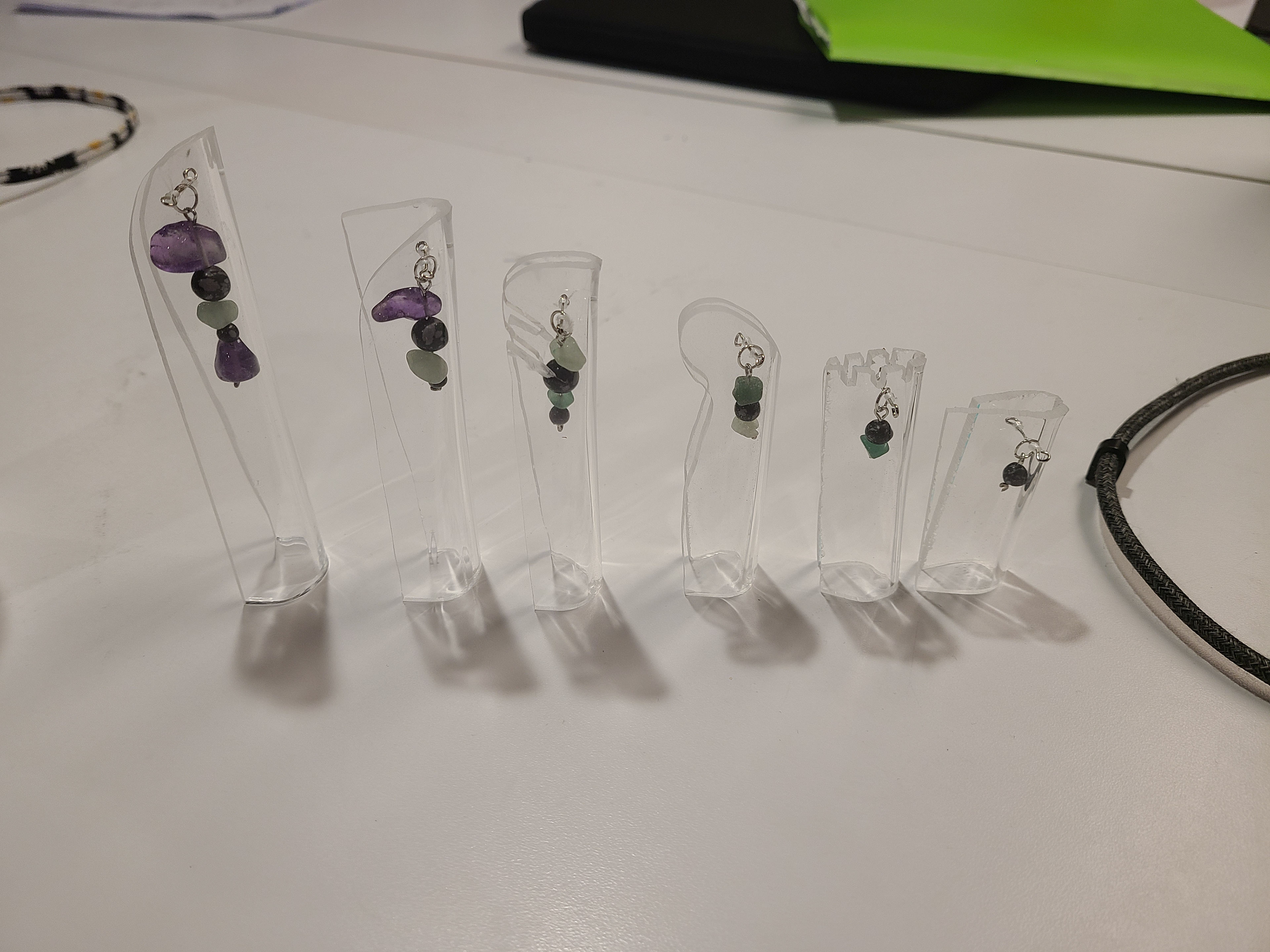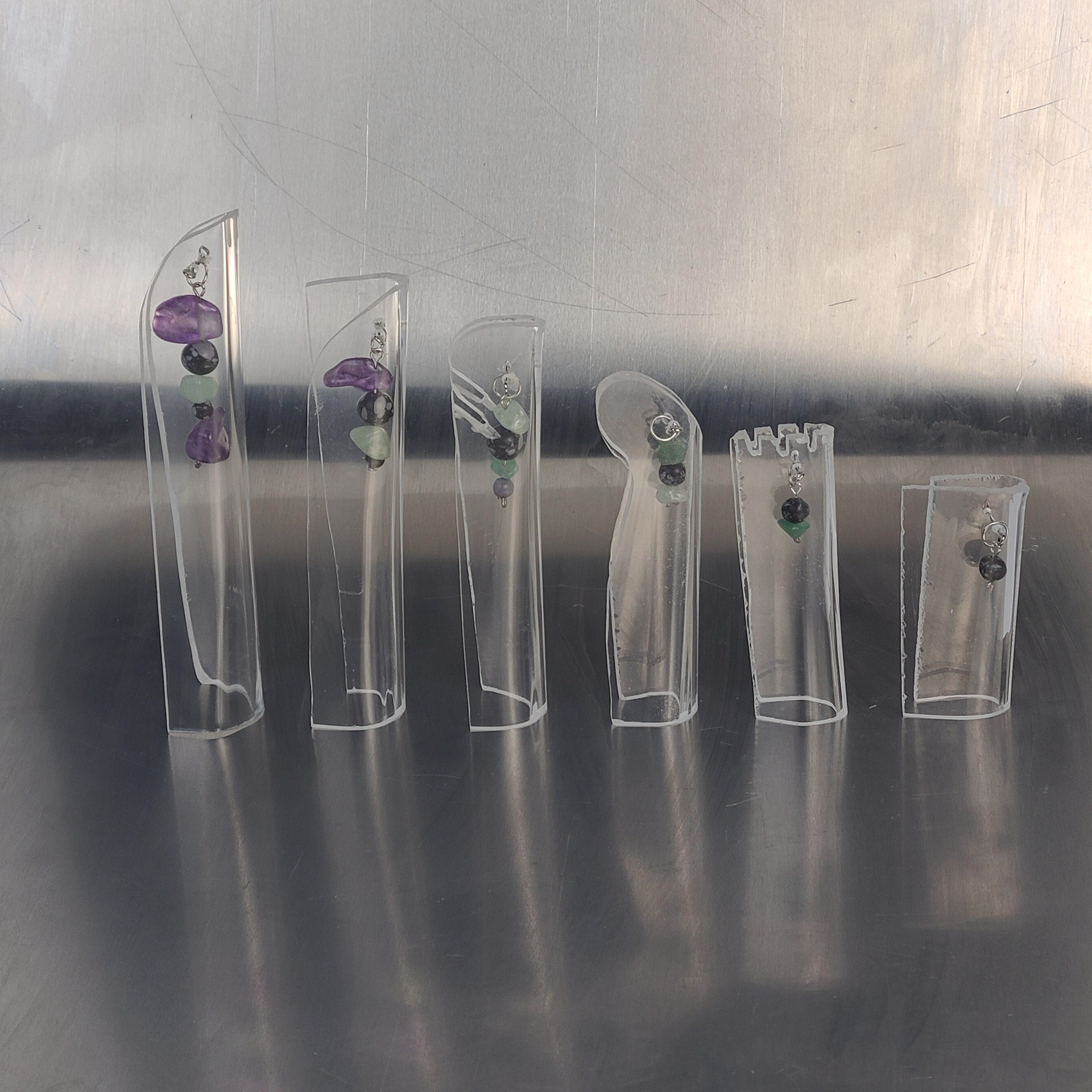 Using the heat from the strip bender pictured here, the acrylic material was bent, stretched, and warped in many different ways. This was a quick and efficient way to create the shapes that would best fit with the crystals.