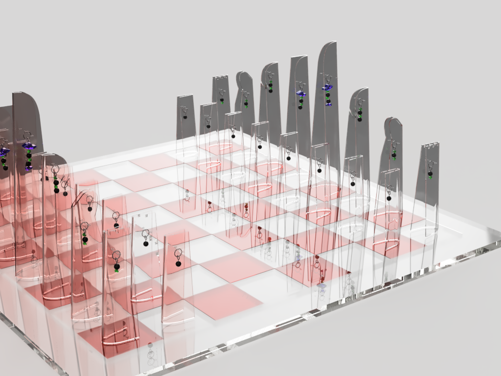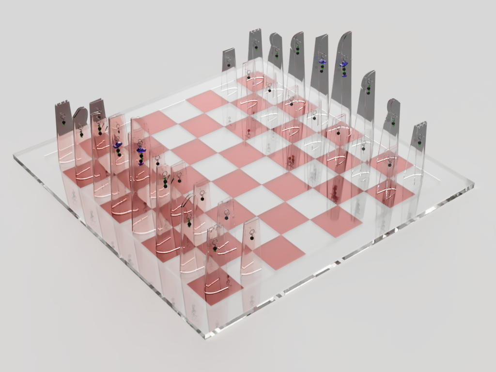 The chess board is made of clear and red acrylic tiles with a clear acrylic boarder to reflect the colors of the chess pieces. The clear and red colors also emulate the classic black and white chess board.